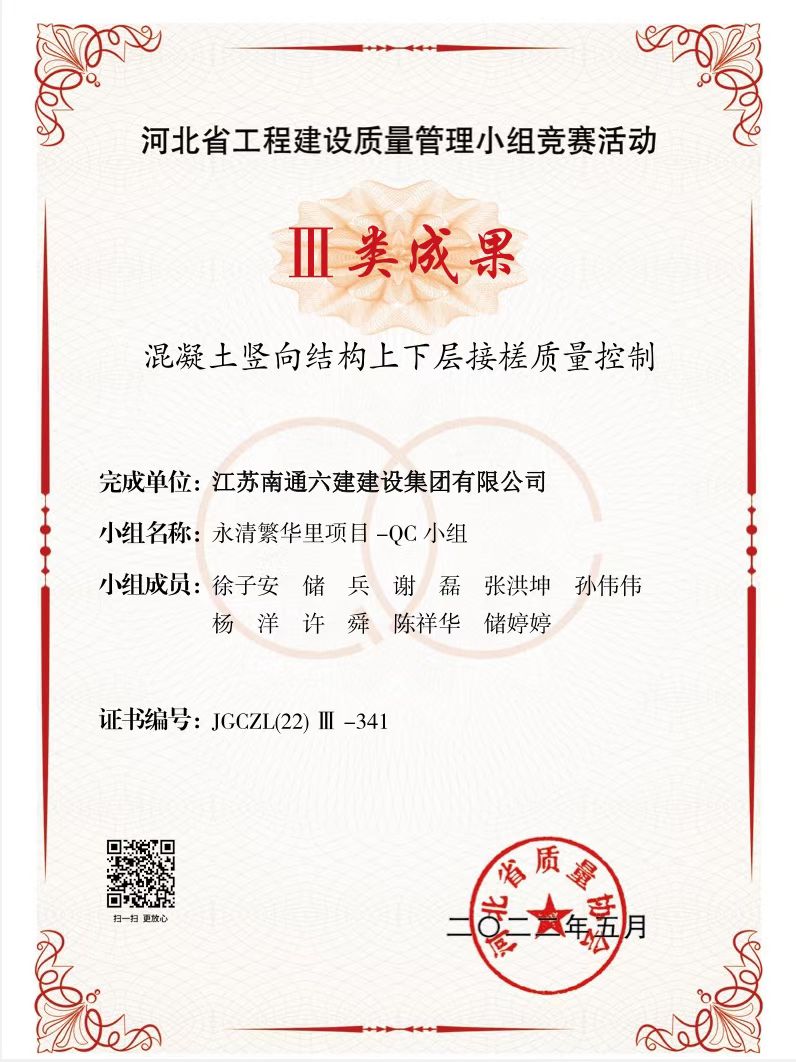 | 4 | 提高無(wú)粘結(jié)預(yù)應(yīng)力筋一次施工合格率 | 南通市QC一等獎(jiǎng) | 2023.3 | 蘇中公司 |