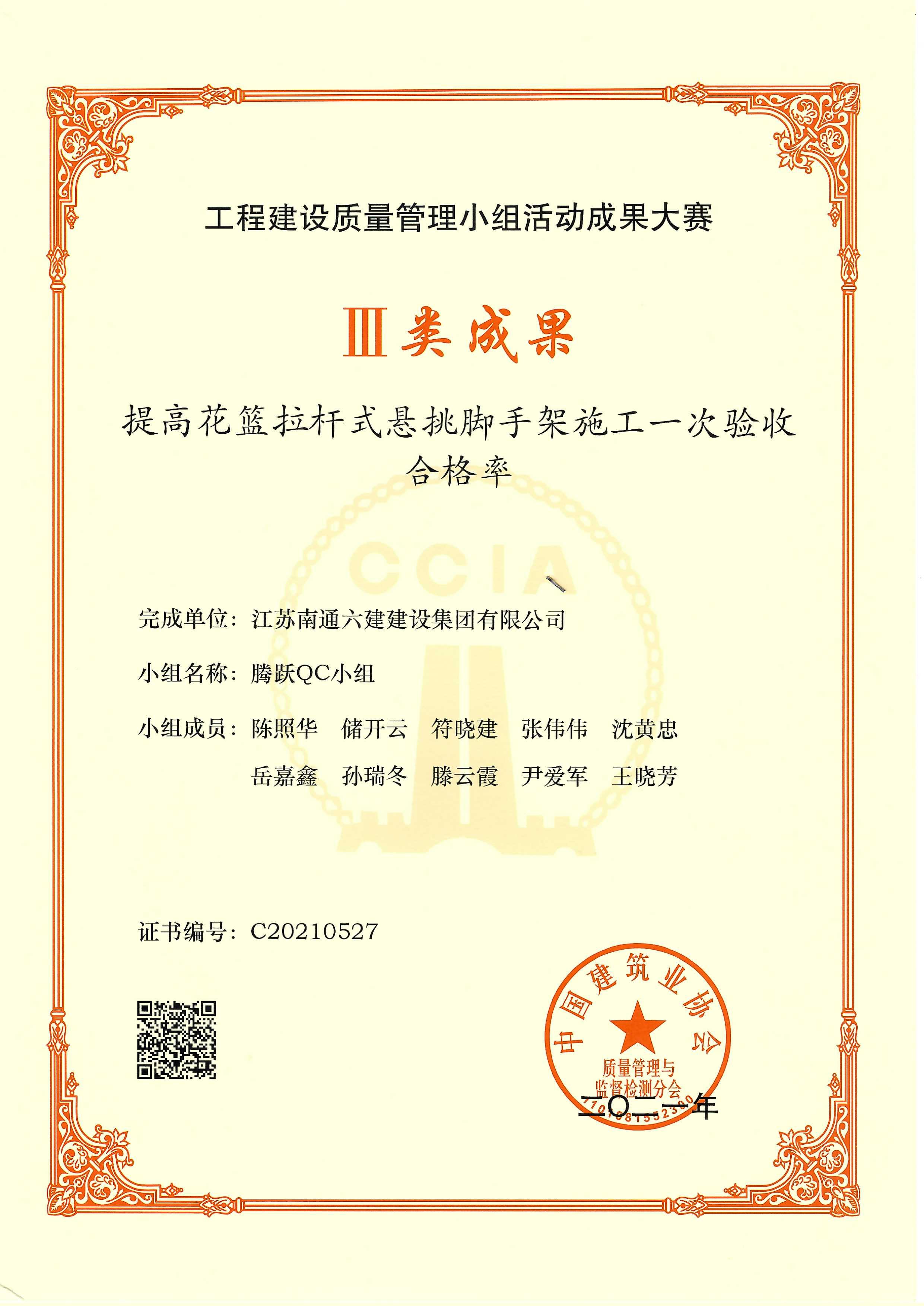 | 25 | 騰躍QC小組提高花籃拉桿式懸挑腳手架施工一次驗(yàn)收合格率 | 國(guó)家級(jí)QCⅢ類成果 | 2021.11 | 內(nèi)蒙古總公司 山東總公司 |