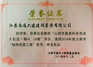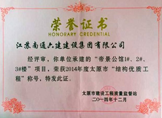 2008年度響應(yīng)太原市委市政府、太原城市建設(shè)委員會參加了四川抗震救災(zāi)、援川建房,山西省勞動競賽委員會頒發(fā)的“集體一等功”。2011年到2016年連6年榮獲江蘇省住房和城鄉(xiāng)建設(shè)廳駐京辦頒發(fā)的“優(yōu)秀進晉企業(yè)”。